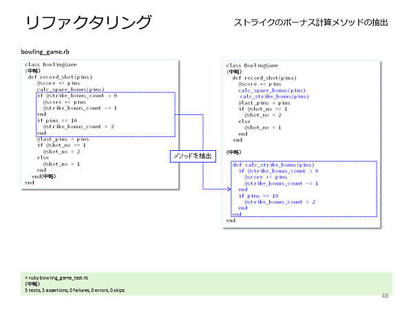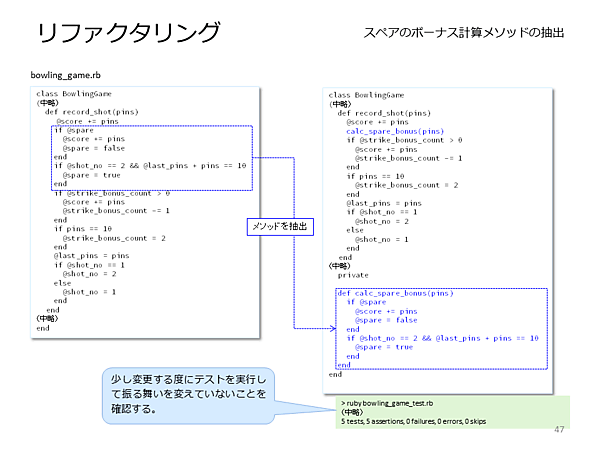 - [高梨] それは、古谷さんの成長の証拠だと思いますよ。ではリファクタリングに入りましょう。まず、スペアの判定と計算を行っている部分を、別メソッドにしましょう。別メソッドにしたら、その時点でテストも行ってください。といっても、テストメソッドを実行するだけで大丈夫です。