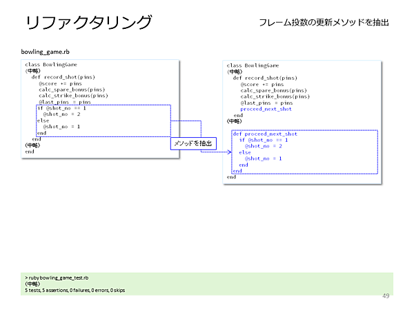 - [高梨] 素晴らしいです! ではついでに、投球がフレームの2投目かどうか判断させる部分も別メソッドにしましょうか? メソッド名はproceed_next_shotなんてどうでしょう?