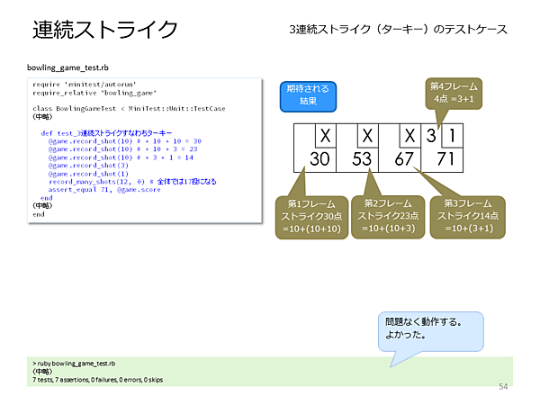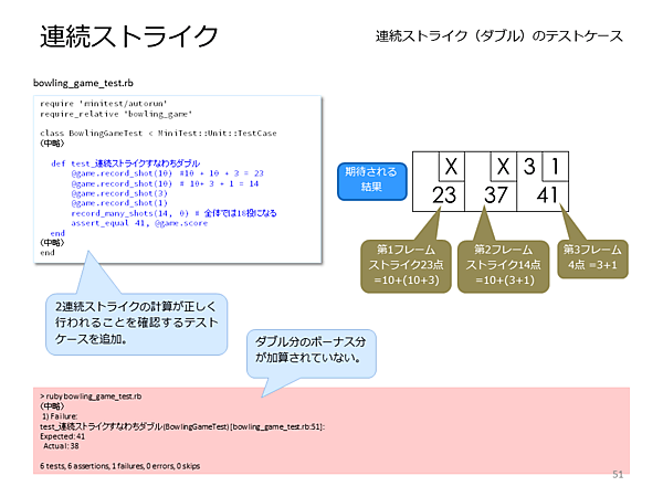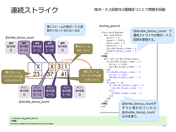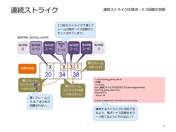 - [高梨] 難しく考える必要はありません。直後の2投球がボーナスになるので、最初のストライクのボーナスが10+3、次のストライクのボーナスが3+1になります。倒したピン数の合計は24なので、ボーナスとあわせて、41になります。それでは、連続ストライクのテストを実装後、実行してください。