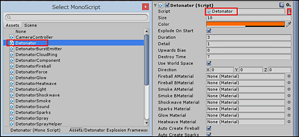 続いて「Cube1」に対して爆発の設定を行います。「Cube1」の「Inspector」の「Add Component」から[Scripts]ー[Detonator Test]を選択します。すると「Inspector」に「Detonator Test(Script)」が追加されますので、「Script」の横にある小さな「◎」アイコンをクリックして、「Select MonoScript」を表示し、一覧から「Detonator」を選択します(図1)。