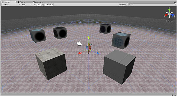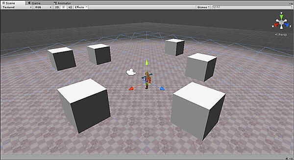 最後に、「Add Component」から[Physics]−[Rigidbody]と選択して、「Rigidbody」を追加します。「Rigidbody」は重力を表し、この設定を抜かすと爆発物が飛び散りませんので注意してください。これで、「Cube1」の爆発の設定は終わりです。Cube1を選択して、マウスの右クリックで表示される「Duplicate」から複製を作成し、合計6個にします。名前はそれぞれ「Cube2」~「Cube6」としておきます。配置は各自が好きな場所に配置してください。筆者は図10のように配置してみました。