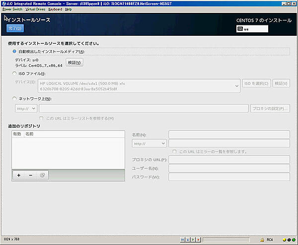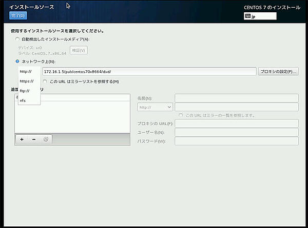 CentOS 7のインストーラーから、インストール元を選択できるようになっており、ローカル接続の物理インストールメディアの他、ISOイメージファイル、HTTP、HTTPS、FTP、NFSでのインストールが可能です。ネットワークインストールを行うには、インストーラーで事前にNICに対してIPアドレスとネットマスク等を設定し、インストール元とネットワーク通信が出来る状態にしておく必要があります。