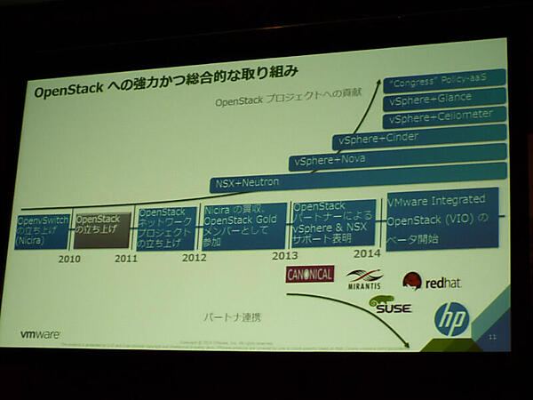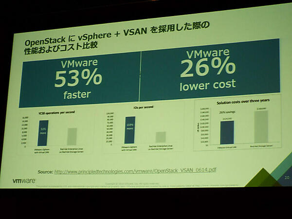 セッションは次にVMwareのコンポーネントを使った時とRed Hatのコンポーネントを使った時の比較に移り、如何にVMwareのコンポーネントを使ったOpenStackが優れているかを説明した。この比較ではOpenStackの下位にvSphereとVMwareのストレージ製品であるVirtual SANの組み合わせた場合とRed Hatのハイパーバイザ、KVMとRed Hat Storageを組み合わせた場合を比較し、性能と3年間の保有コストを比べている。比較には米国Yahoo!が開発したベンチマークテスト、Yahoo Cloud Serving Benchmarkを使い、アプリケーションとしてApache Cassandraを稼働させた場合、VMwareのほうが53%高速で、ストレージへのIOPSもRed Hatの場合と比べて159%も高速であるという。またオープンソースだからソフトウェアは無料と思われがちだがRed Hatの提供するサポートを受けることまで計算すると3年間のソフト、ハード、サポートのコストはVMwareのほうが26%安くなるという。Red Hatが推奨するストレージ構成の場合、VMwareの構成に比べて専用のサーバーが必要となり、そのハードウェアの増加分がコストを押し上げている計算になる。より詳しくはこちらの資料(PDF)を参照されたい。Red Hatとの比較。vSphere + vSAN vs. RHEL KVM + Red Hat StorageVMwareのOpenStackはVOVAとVIO OpenStackを最初に検討し始めた時よく聞く不満としてチュートリアルに相当するドキュメントが無く、わかりづらいという内容が多い。またOpenStackはコンポーネントも多くそれらを適切に構成するのは難しい。そんな不満を見透かしたようにVMwareが提供するのは2つのOpenStack関連のパッケージだ。一つ目はVOVA(vSphere OpenStack Virtual Appliance)、2つ目はVIO(VMware Integrated OpenStack)だ。VOVAは1年ほど前に公開された、ある程度VMwareを理解できるエンジニア向けのノンサポートパッケージ、簡単にVMwareベースのOpenStackを体験できるという。VIOはOpenStackとVMware製品を組み合わせて検証を行い、最も安全でかつ高速なVMware版のOpenStackというふれこみだ。オープンソースでしばしば問題になる「問題が起こった時に誰が責任を持ってくれるのか?」に対する完全ではないが次善の解決策とでも言えるのではないだろうか。ただし、日本での扱いについては未だ決まっていないらしく、vForumのセッションでは紹介のみということだった。VMwareのほうが53%高速で26%安い、と主張仮想化の技術と実績を持つVMwareだからこそOpenStackにおいても最高の性能と安心できるサポートを得られるということが、エンタープライズ向けのプライベートクラウドを検討している情報システム部門の担当者に向けたVMwareのメッセージといえるだろう。VIOとは?セッションの最後で遠藤氏は、VMwareとしてのOpenStackへの取り組みをまとめ、「単一ベンダのサポート」という項目ではVMwareがOpenStackのコードですらもサポートすると説明し、セッションを締めくくった。OpenStack構築の際の選択肢にVMwareのコンポーネントを混ぜて構築OpenStackのセッションの後に始まったジェネラルセッションではVMwareのCEO、パット・ゲルシンガー氏が登壇。OpenStackやコンテナー技術にも言及し、エンタープライズ向けの仮想化の拡がりを印象付けた。ここでもOpenStackは一つの選択肢であり、他にも選択肢はあることを強調した。 そして2014年8月のVMworld 2014で発表されたEVO:RAILの上位機種としてEVO:RACKが紹介された。EVO:RAILはいわゆるハイパーコンバージドアプライアンスのためのソフトウェアで、VMwareがソフトを提供し、ハードウェアメーカーがそれに準拠した2Uのラックマウント型サーバー群と組み合わせてパッケージされたアプライアンス製品だ。新興のNutanixやTintri、EMC Isilonなどのソフトウェアで実現するスケールアウト型ストレージと同じくCPU、メモリ、SSD、HDD、ネットワークインターフェースがセットになっている。VMwareとしてVIOを積極的に推進VMwareがEVOシリーズとしてソフトを提供し、これまでのパートナーであるDELLやEMCが準拠するハードウェアと組み合わせることで信頼性のあるハードウェアとソフトウェアによって差別化が可能だとVMwareは考えているようだ。現行のEVO:RAILではまだ構成出来る最大のノード数など拡張性に劣る部分もあるが、EVOシリーズは上位機種の発表によって拡張性はカバーできると考えているのだろう。EVO:RACKは主にデータセンター規模のサイトでの導入を狙っているという。 仮想化の実績をベースにOpenStackからハイパーコンバージドアプライアンス、プライベートクラウドまでも提供することでこれまでのVMwareのエンタープライズだけではなく中小規模市場までも狙うVMware、引き続き注目したい。EVO:RACKを紹介するゲルシンガー氏