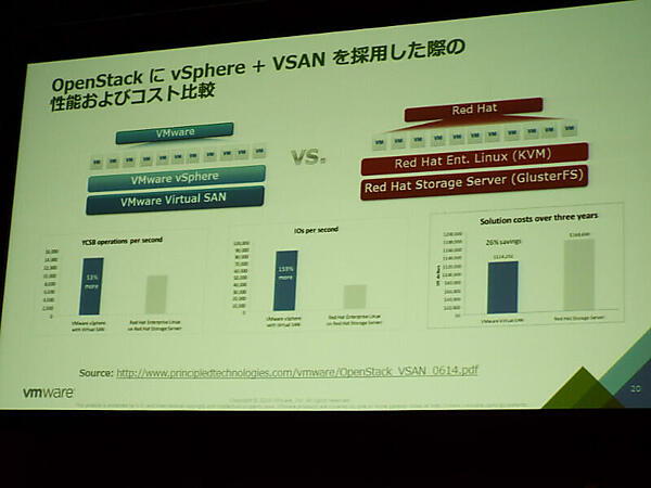 セッションは次にVMwareのコンポーネントを使った時とRed Hatのコンポーネントを使った時の比較に移り、如何にVMwareのコンポーネントを使ったOpenStackが優れているかを説明した。この比較ではOpenStackの下位にvSphereとVMwareのストレージ製品であるVirtual SANの組み合わせた場合とRed Hatのハイパーバイザ、KVMとRed Hat Storageを組み合わせた場合を比較し、性能と3年間の保有コストを比べている。比較には米国Yahoo!が開発したベンチマークテスト、Yahoo Cloud Serving Benchmarkを使い、アプリケーションとしてApache Cassandraを稼働させた場合、VMwareのほうが53%高速で、ストレージへのIOPSもRed Hatの場合と比べて159%も高速であるという。またオープンソースだからソフトウェアは無料と思われがちだがRed Hatの提供するサポートを受けることまで計算すると3年間のソフト、ハード、サポートのコストはVMwareのほうが26%安くなるという。Red Hatが推奨するストレージ構成の場合、VMwareの構成に比べて専用のサーバーが必要となり、そのハードウェアの増加分がコストを押し上げている計算になる。より詳しくはこちらの資料(PDF)を参照されたい。