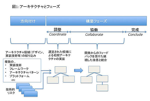 図1は、アーキテクチャ実装の観点からフェーズをみたモノです。ゼロから開発をする場合には、アーキテクチャのデザインやその実装技術を、複数の候補から選択しなければなりません。この候補の選定は、一般的には方向付けフェーズで行います。同時に、プロダクトへのSLA等をインプットとして、技術的リスクの(初期の)リストを作ります。ここで影響度の大きなリスクをターゲットに、方向付けで選定された技術を使ってアーキテクチャの実装を行うのが構築フェーズの前半、図1で「調整」とされている時期です。