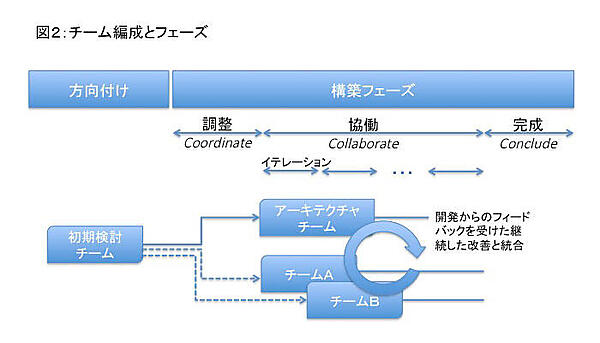 初期アーキテクチャが構築されたら、後続の「協働」では、ストーリーの開発と、アーキテクチャのブラッシュアップが並行して進みます。ここで視点を変えて、チーム編成とフェーズの関係を考えてみましょう(図2)。