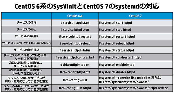 以下に、CentOS 6系のSysVinitのコマンドと、CentOS 7で採用されているsystemdのコマンドの対応関係を表にまとめておきますので、参考にして下さい。