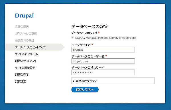 データベースの設定で作成したデータベース名、ユーザー名、パスワードを入力してください。
