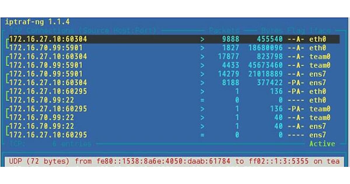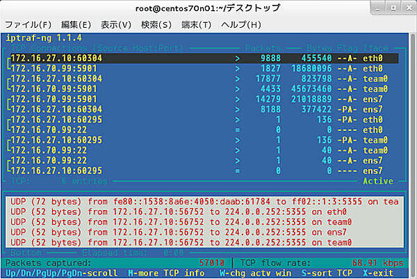 チーミングされた仮想的なインタフェースteam0を構成する物理NICのインタフェースeth0とens7がラウンドロビンでパケットを処理し、スループットが出ているかの確認をするために、視覚的にしかも直感的に理解できるiptraf-ngというツールがあります。iptraf-ngは、OSが認識しているネットワークインタフェース全てについて、トラフィックの有無、パケットの通信の様子を確認することができます。コマンドライン上からiptraf-ngコマンドで起動し、テキストベースの分かりやすい画面インタフェースが特徴的です。