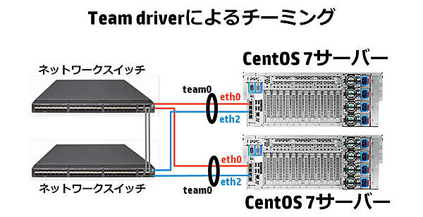 図5:サーバー側のeth0とeth2をスレーブインタフェースにし、仮想的なインタフェースteam0を構成している。eth0に障害が発生してもeth2が通信を引き継ぐ。この構成では、1台のスイッチ障害にも対応している