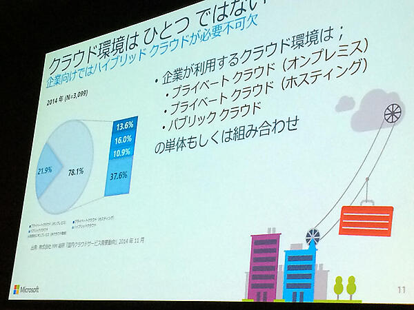 澤氏はインターネットイニシアチブ、エクイニクスジャパン両社のゲストを招き、Azureと連携したサービスを紹介しながら、企業ユーザーにとってのパブリッククラウドサービス利用を促進するキャンペーンを始めたことなどを説明した。マイクロソフトのエンタープライズビジネスを支えるパートナーを立てることで、これまで通りパートナー中心のビジネスを展開するというメッセージであったように思える。