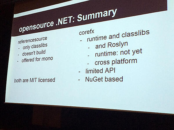 このセッションでは、現状の.NETフレームワークのオープンソース化の状況や、Mono、Xamarinの開発状況などが解説された。このセッションの要点はマイクロソフトの言う“.NETのオープンソース化は具体的にはどうなっているのか?”についてMonoを開発している第3者が俯瞰するということだ。