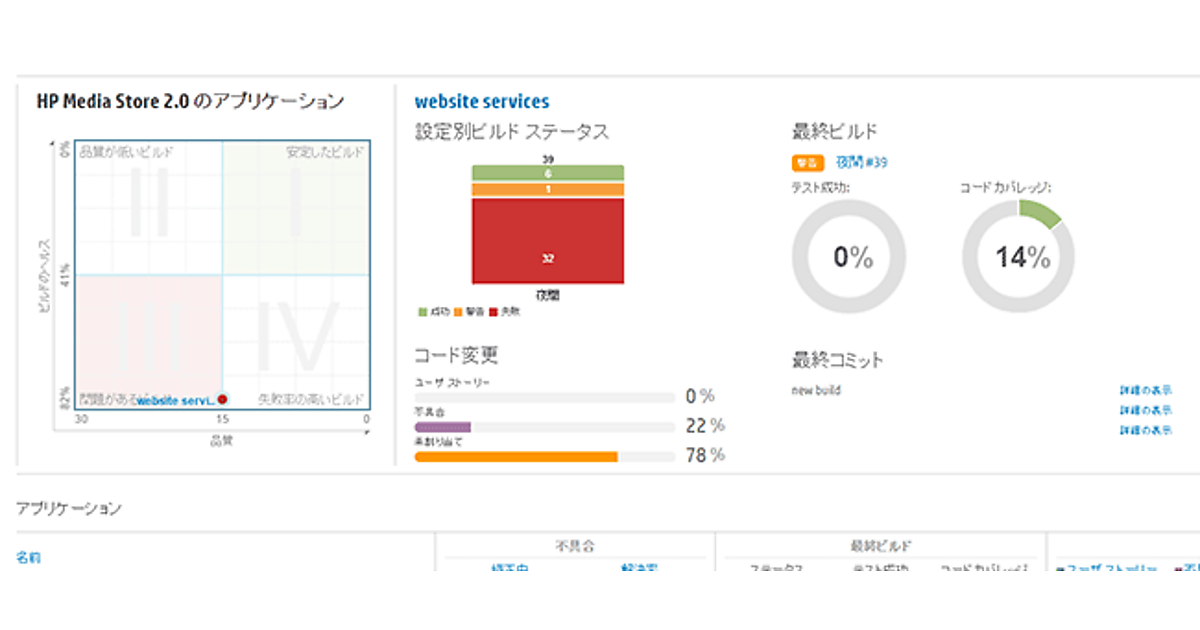 そのための手段として、Agile Managerではリリースサマリ(図2)とアプリケーションサマリ(図3)を提供しています。どちらの情報も、Agile Managerと連携するソースコード管理システム(Git等)とCIツール(Jenkinsと、連動する単体テストツールやコードカバレッジツール)から得られた情報をもとにアウトプットの質を可視化する手段です。