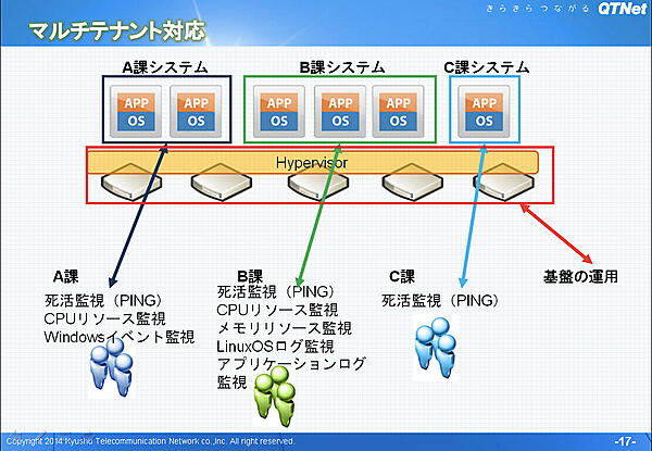 QTNetは、宮崎県サーバ統合基盤を宮崎県専用のクラウドサービス(IaaS)として構築・提供し、県が保有する約70の業務システム(300台以上のサーバ)を統合基盤に順次移行している。この宮崎県サーバ統合基盤は、津波などの災害時のDR対策も兼ねて進められている。そして、その基盤設備(物理サーバ、ネットワーク機器等)と仮想サーバ群、業務システムの監視をZabbixで実現している。