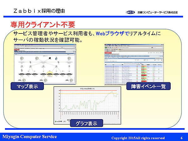きっかけは、2010年導入の旧監視環境が2015年3月に更改時期となるため、その後継となるものを探していた際に、前述のQBS事例の紹介を受けたこと。採用理由としては、単純に低価格というだけではなく、サーバノード数の変更の際にエージェントライセンスの買い直しや追加調達が不要であり、監視系も含めて迅速にサーバ追加に対応できることもメリットである。機能面では、Webブラウザで監視可能で専用クライアントが不要な点は、IDC利用者である顧客向けの画面を提供しやすい点が挙げられる。
