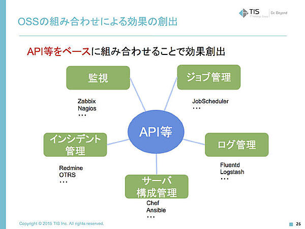 現在、企業ITはプライベート環境とパブリックなクラウドが共存したハイブリッドクラウドに移りつつあり、そこでの運用管理・監視ツールはOSSが適している。クラウドを含む仮想化された基盤では、ソフトウェアの層が多くなり、運用作業を自動化することが可能になっている。また、各社のクラウド基盤が提供する機能ともAPIで連携させることで、自動化が可能になっている。