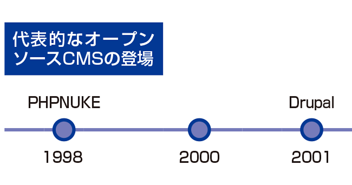 CMSの歴史はそれほど古くはありません。最も古いシステムでも、ほとんどが2000年以降に登場したシステムです。オープンソースのCMSを対象とすると、古参のシステムとしては、PHPNUKE(1998年)、これをベースにして開発されたXOOPS(2002年v1リリース)、BBSをもとに発展したDrupalなどが挙げられます(2001年にオープンソースプロジェクトが開始)。Drupalは2008年にオープンソースCMSアワードを受賞していますし、管理機能に優れた特徴を持つJoomla!(2005年リリース)など、いずれも数多くのユーザーがおり、海外の行政機関や大手企業で導入されている実績があります。その中でもWordPress(2003年に最初のバージョンがリリース)は、現在最も多くのユーザーが利用しているCMSであるといわれています(リリース年度は、Wikipediaから引用)。