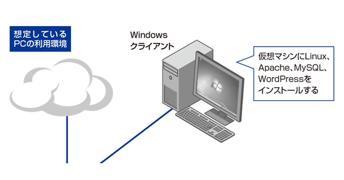 本書では、LinuxマシンをWindowsの中に作成し、そこにWordPressをインストールしていきます。仮想マシンというと何やら難しそうですが、実体はWindowsアプリケーションとして動作します。Windows環境でPCのハードウェアをエミュレートして、擬似的なハードウェア環境を作り出します。これも使ってみればすぐにわかります。