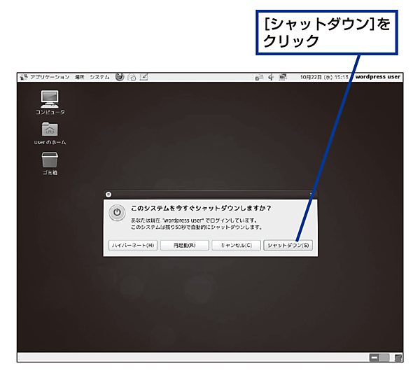ここまでの手順では、ウィンドウメニューからシャットダウンを選びましたが、コマンドラインからシャットダウンやリブートを行うことができます。シャットダウンを行うには、rootに切り替えてから、「shutdown -h now」、リブート(再起動)するには、「reboot」を実行します。OSをシャットダウンせずに仮想マシンを終了すると、OSのイメージが壊れる場合があるため、必ずシャットダウンしたあとで、仮想マシンを終了してください。