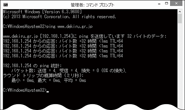 コマンドプロンプトを起動して、pingを実行。コマンドプロンプトでLinuxサーバー(www.dekiru.gr.jp)にpingを実行する。