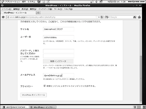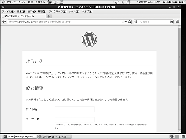 "http://www.dekiru.gr.jp/wordpress/にアクセスすると"WordPressのページが表示されます。任意のサイト名とユーザー名を入力してください。「www.dekiru.gr.jp」の部分は、第8回目〜第11回目で設定したWebサーバーのホスト名に読み換えてください。