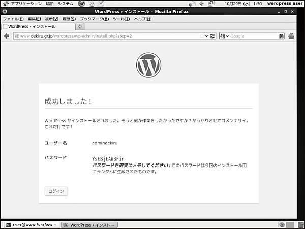 インストール成功のメッセージが表示されます。そしたら管理者のユーザー名とパスワードを確認して、画面左下のボタンからログインします。