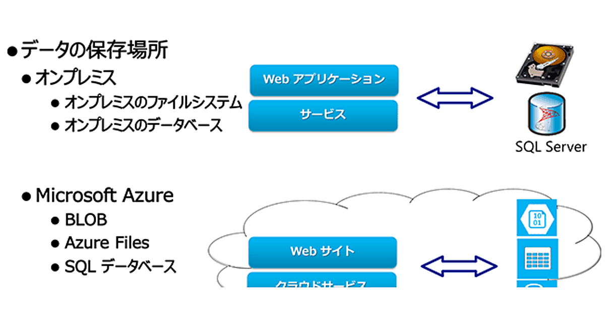 一方、Webアプリケーションが扱うデータをローカルディスクやファイルサーバに格納している場合は、保存場所を変更し、コードも書き換える必要があります。これは、Azureの場合、ローカルのディスクにデータを格納していると、データセンターのサーバに障害が発生するなどしてインスタンスが作り直された際に、データがなくなってしまうからです。そのため、Azureが提供するBLOBやAzure Filesにデータを格納します。BLOBは、RESTまたはAzure Storage Client Libraryによりデータの読み書きが行えます。またAzure FilesはSMB がサポートされていて、Azure上のストレージをWindowsのファイルシステムのように扱えるため、アプリケーションが利用するファイルI/Oのライブラリ が利用できます。