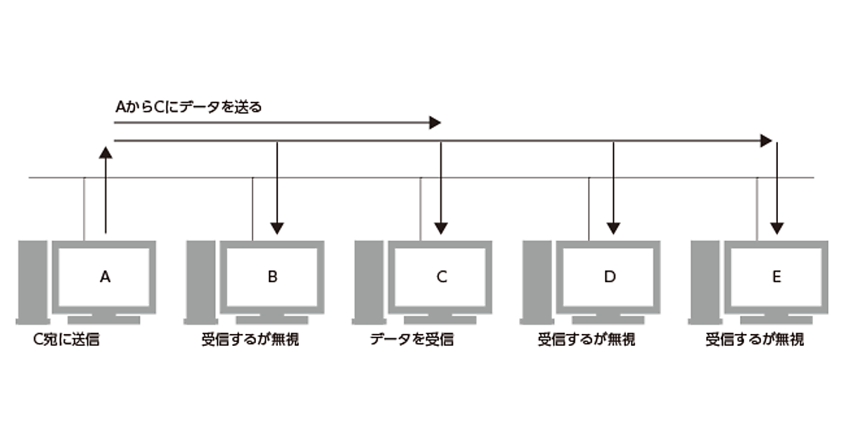 シリアルポートを使って2台のコンピュータを接続する場合、それぞれのコンピュータの通信相手は、常にもう1台のコンピュータです。この場合、通信の相手を識別する必要はありません。しかし3台以上のコンピュータをネットワークで接続する場合は、データをどの相手に送るかを指定しなければなりません。スイッチ(交換機)を中心に置いたスター型ネットワークであれば、自身とどのコンピュータの間で通信するのかを、スイッチに指示する必要があります。リング型ネットワークやバス型ネットワークの場合、あるコンピュータから送信されたデータは、ほかのコンピュータにも到達します。しかし本来の宛先はその中の1台だけであり、宛先以外のコンピュータは、自分宛でない受信データを無視しなければなりません(図1)。