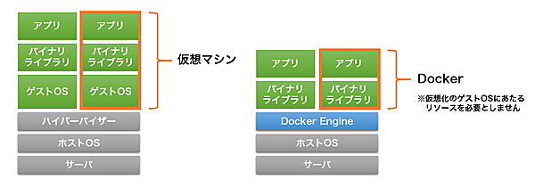 仮想マシンの場合は、ゲストOSを立ちあげる必要があるため、メモリやハードディスクの容量を必要とします。一方のDockerは、Linuxコンテナ技術を用いてLinuxカーネル上に独立したOS環境を素早く構築できるため、仮想マシンの環境に比べて迅速に利用できます。また、Dockerfileという設定ファイルを用いる環境構築の自動化や、Docker Hubという公開リポジトリを通して、Dockerイメージを共有・管理する機能が提供されています。