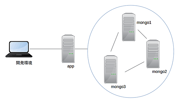 同じ設定をmongod2、mongod3にも行ってください。これでMongoDBノードの設定はOKです。ではappに戻って、mongo1のMongoDBに接続しましょう。