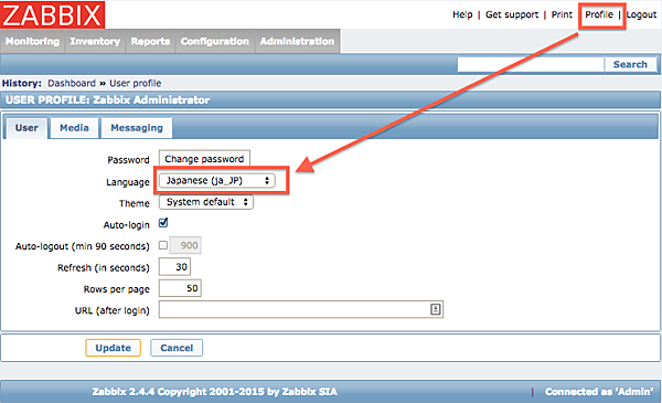 - 次にユーザープロファイルの設定にて「Language」をJapanese(ja_JP)にします。