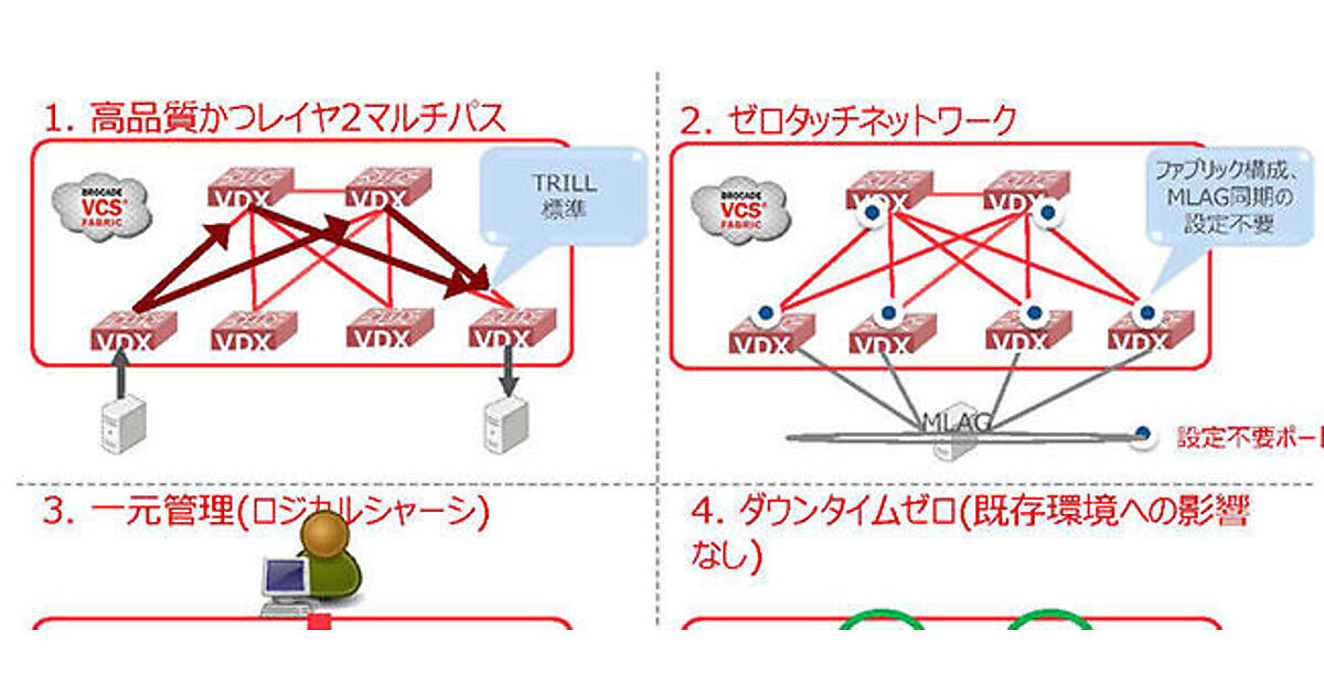 ブロケードは、2011年からL2ファブリックを実現するVDXシリーズデータセンタースイッチファミリを提供しています。主な特徴は、Virtual Cluster Switching(VCS)テクノロジと呼ぶ以下の機能です。