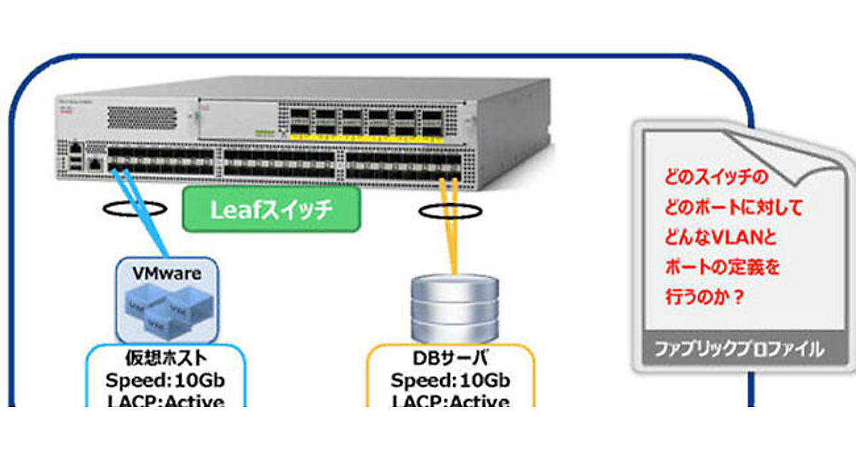 ACIファブリックにサーバーやネットワーク機器を接続する場合、Leafスイッチの物理ポートに接続することになる。従来のネットワークであれば、サーバーやネットワーク機器をスイッチに接続する際、管理インターフェイスからログインし、CLIでポートプロパティの設定などを行っていた。しかし、Cisco ACIではAPICでスイッチポートのリンクスピード、STP、CDP、LLDPやチャネル、VLANなどの設定項目を抽象化し、ポリシーとして定める。そして、ポリシーをまとめたファブリックプロファイルを作り、ACIファブリックに対して適用することで、これらの設定が反映される。また、すでに作成したポリシーは使い回すことができるので、別のLeafスイッチやポートに対して同じ設定を迅速に行うことも可能だ。