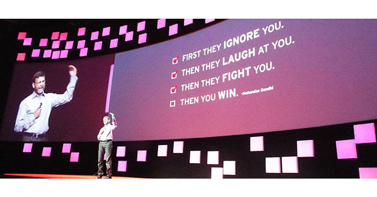 またマハトマ・ガンジーの言葉を引いて既にOSレベルでの戦いは終りが近い、データセンターで最後に勝ち残るのはLinuxであると強調した。コーミアー氏が引用した文章はこれだ。