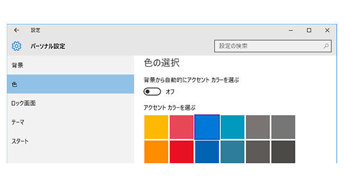こうした場合の選択肢としては、「設定」 ⇒ 「パーソナル設定」 ⇒ 「色」 ⇒ 「背景から自動的にアクセントカラーを選ぶ」をオフにして、アクセントカラーを手動で選択する方法もあります。ただし、アクセントカラーは、選択状態の表示にも使われるため、たとえば、タイルの背景やアプリ内の選択項目の表示、タイトルバーの起動中アイコンの表示などに利用され、背景に対して目立ちやすい色を選択すると、かなり「どぎつい」配色になってしまいます。