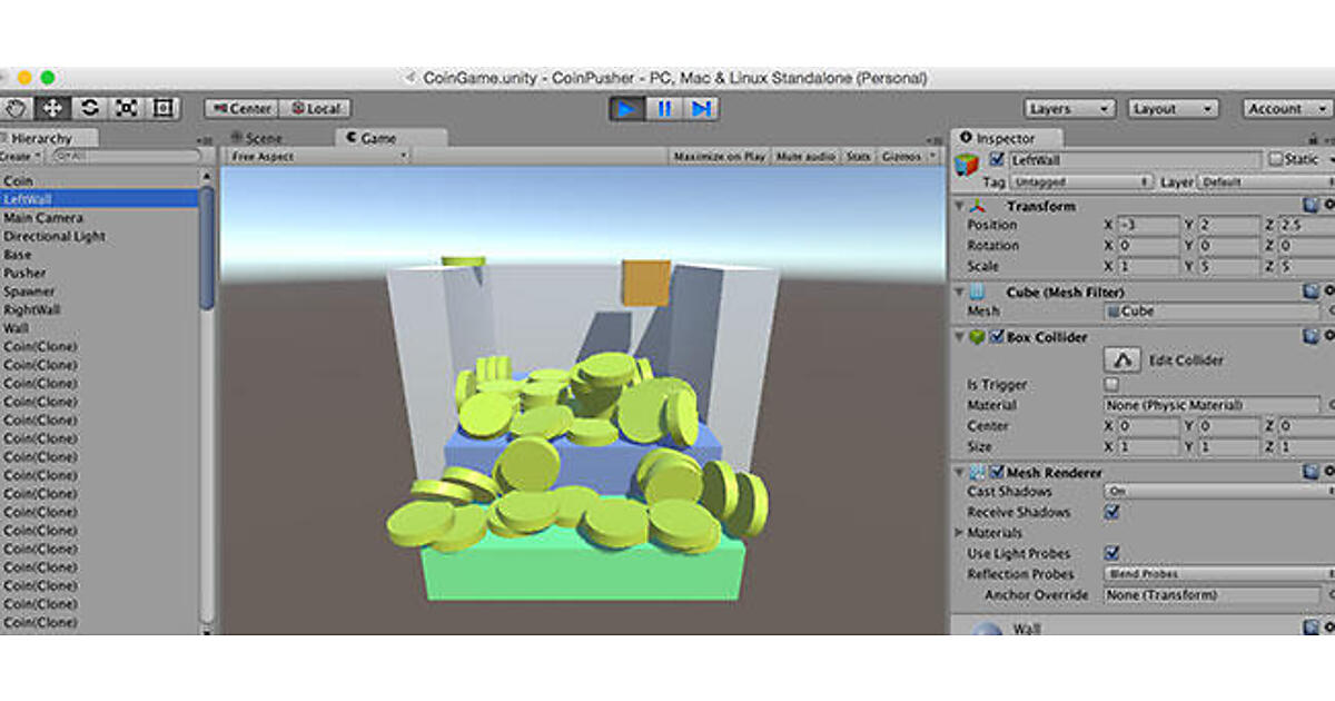 これで基本的なコインプッシャーゲームの仕組みは完成です。次回の後編では、ゲーム製作の総仕上げに入っていきます。