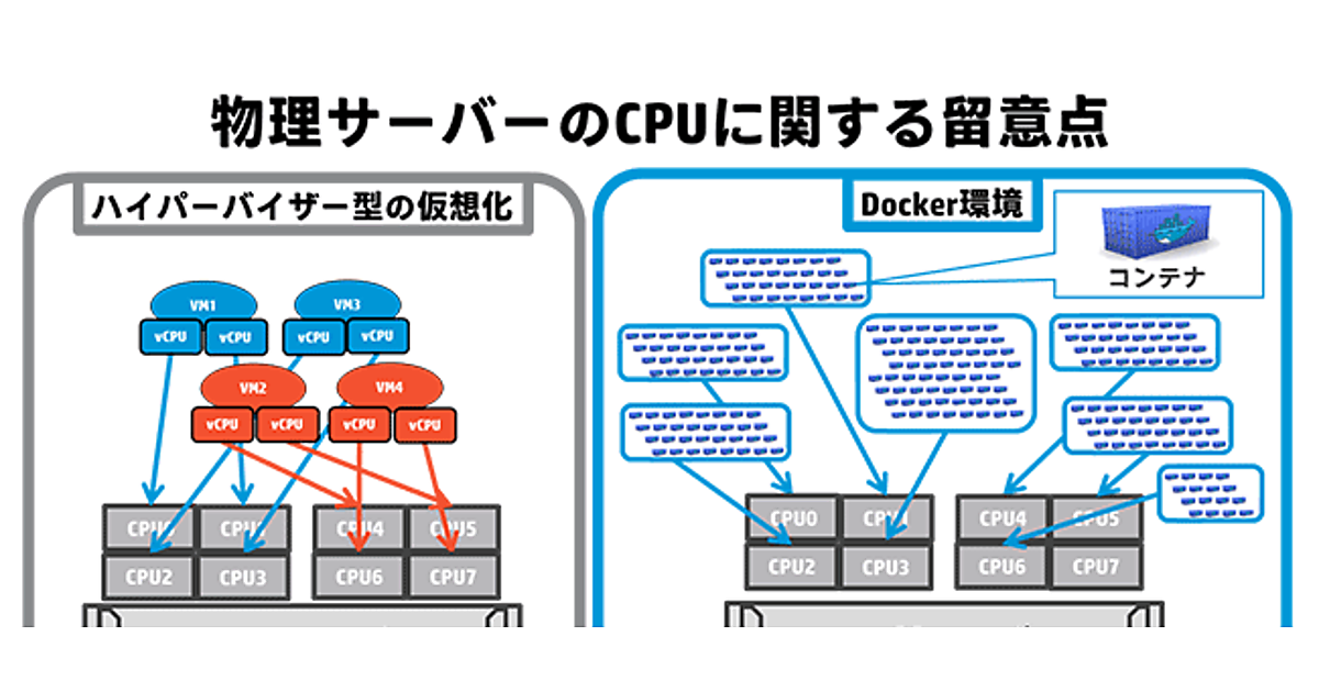 2015年8月下旬現在、最新のDockerでは、64ビットのx86アーキテクチャのサーバーシステムやPCで稼働させることができます。CPUの動作周波数などに特に制限事項はありませんが、まずは、Dockerが稼働するLinux OSがサポートするCPUの動作周波数やコア数などを確認しておくとよいでしょう。RHEL、Ubuntu Server、SLESなどはハードウェアベンダーとOSベンダーのサポートマトリクス(互換性リスト等)を参照すれば動作するサーバー機種とCPUが判明します。