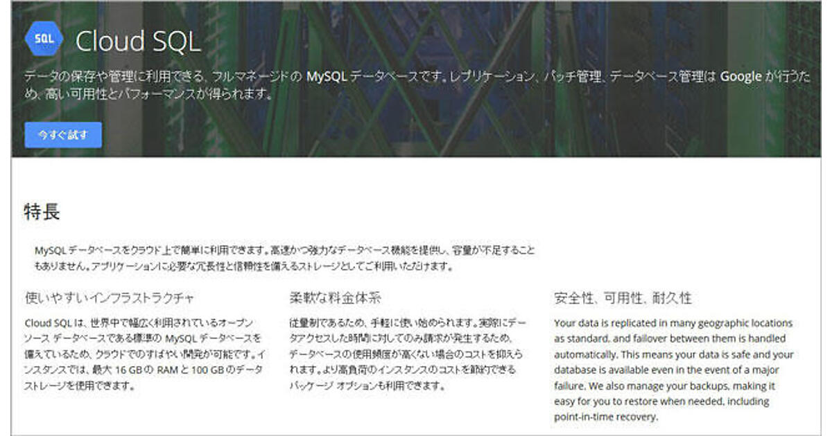 Google Cloud SQLは、GCP(Google Cloud Platform)上で動作するMySQLデータベースです。MySQLのバージョンは5.5または5.6がサポートされておりますが、2015年5月時点では、バージョン5.6はベータ版扱いとなっています。