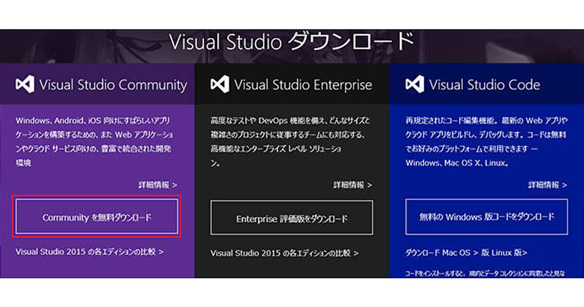 Visual Studio Community 2015は下記のURLからダウンロードできます(図1)。
