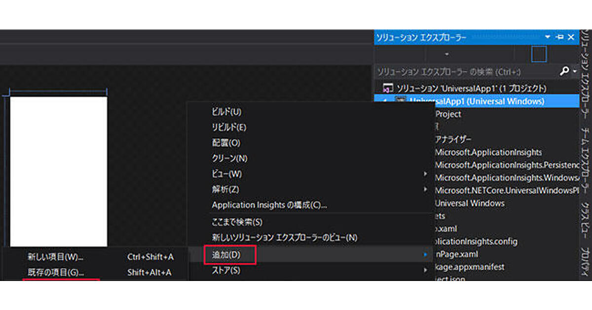 ソリューションエクスプローラー内の「UniversalApp1(Universal Windows)」を選択した状態でマウスを右クリックし、表示されるメニューから「追加」→「新しいフォルダー」と選択します(図1)。