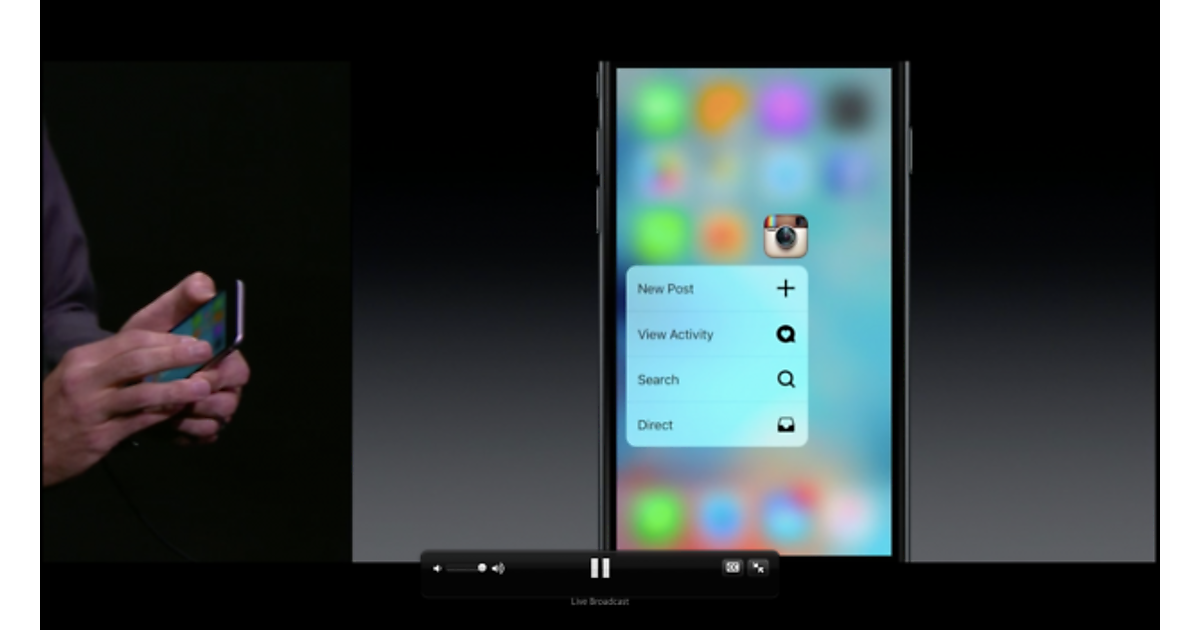 iPhoneのホーム画面で、アプリのアイコンを長めにプレスすると、ユーザーはいくつかのアクションを選ぶことができる。アップルの幹部、クレイグ・フェデリギは、ユーザーがDropboxでファイルのアップロードを直接起動したり、Instagramで最近のアクティビティにすぐジャンプしたりできるのを示した。