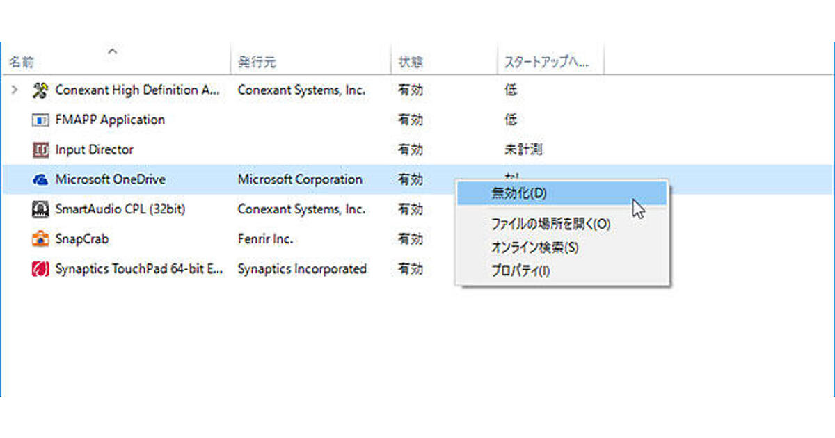 タスクスケジューラが制御するタスク(この場合はOneDrive.exe)を制御する関係から、初回の起動もタスクスケジューラに行わせる必要があります。これは、タスクスケジューラは自分が起動したタスクのプロセス番号を記憶しており、重複起動を避けたり、タスクを終了させる場合、自身が起動したプロセスが対象になるからです。このため、スタートアップとして登録されているOneDrive.exeを無効にして、タスクスケジューラのみが起動を行うようにします。このためには、タスクマネージャーの「スタートアップ」を利用します。ここに「Microsoft OneDrive」という項目があるので、右クリックで「無効」を設定し、勝手にOneDrive.exeが起動しないようにします(図1)。