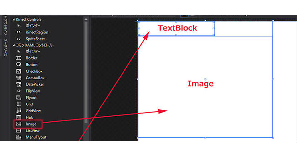 - Nameが「TextBlock1」というTextBlockと「Image1」というImageを配置しプロパティを設定している