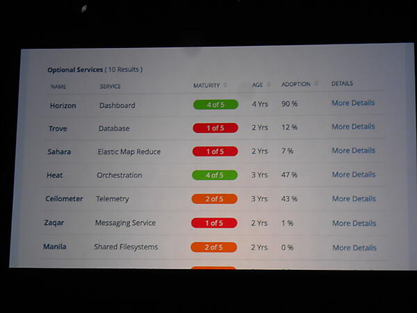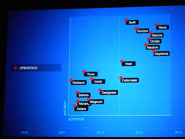 その後、Jonathan Bryceが完成度と採用数を軸にOpenStackの各コンポーネントの状況を紹介しました。Nova、Swift、Horizonといった比較的古参のコンポーネントが成熟して採用が進む一方、Heat、Trove、Ceilometerといった比較的新参のコンポーネントが発展途上で採用が少ないことが示されました。