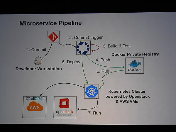 続いて、Lithium TechnologiesのLachlan Evensonが登壇。同社で開発した、ソースコードのコミット後のビルド、テスト、Dockerコンテナー作成、本番環境デプロイ(OpenStackとAWS上のKubernetes環境)を行う自動ワークフローシステム「Kubot」、システム状態表示ツール「Realtime」について説明。サンプルのゲームアプリのソースコード変更後に最終的にアプリケーションがアップデートされるまでのデモを示しました。