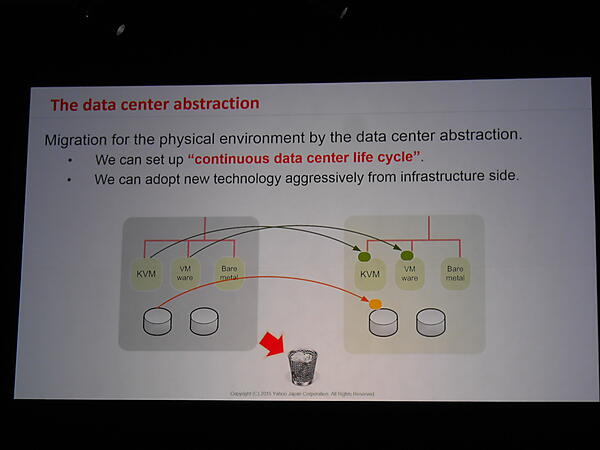 次に、ヤフーの伊藤氏が登壇。月間約650億ページビューにのぼる同社のWebサービスを支える基盤としてOpenStackを紹介。元々は自社製のクラウド基盤を使用していましたが、2013年にOpenStackを採用。これにより、アプリケーション開発者はハードウェアやハイパーバイザの違いを意識する必要がなくなり、アプリケーションの配置の自由度が向上。結果的に物理基盤のライフサイクル管理が容易になったとメリットを挙げました。