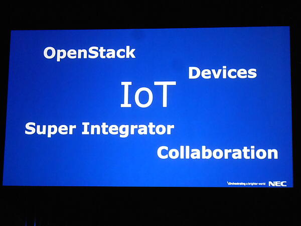 「Bringing the New Value to OpenStack Ecosystem」と題して、NEC柴田氏が登壇。「Super Integrator」をキーワードに同社の取り組みを紹介。将来IoTを支えるものとして、デバイス、OpenStack、Super Integrator、コラボレーションを挙げました。
