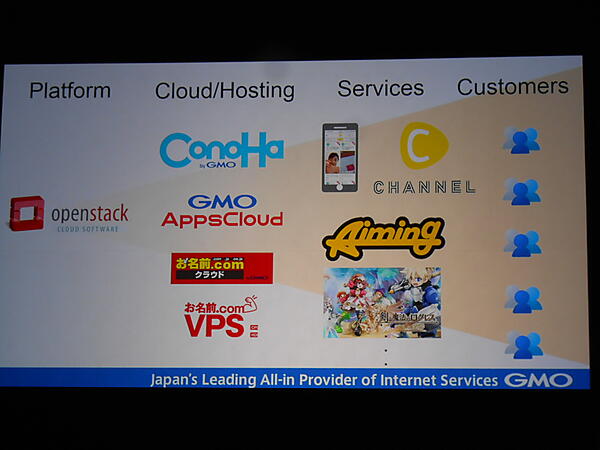 その後、GMOインターネットのパブリッククラウドサービス2種(ConoHa、AppsCloud)について紹介。ConoHaのユーザとしてモバイル動画アプリのC Channel、AppsCloudとしてモバイルゲームのAimingが登壇、それぞれのサービスを紹介しました。