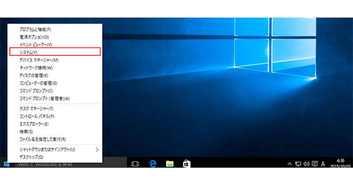 Windows 10の「コントロールパネル」−「システムとメンテナンス」−「システム」を開きます。スタートメニューを右クリックして、コンテキストメニューから「システム」を起動します。