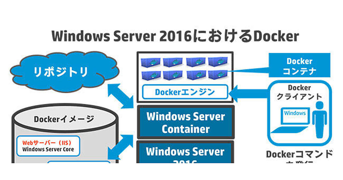 Windows Server 2016では、Windows Server Containersが提供され、Dockerの仕組みを利用することができるようになっています。従来のハイパーバイザー型の仮想化の機能もさらに強化されますが、新しくコンテナ技術を採用し、Linux版のDocker環境と同様に、軽量なOSとアプリケーション環境を実現します。Windows Server 2016におけるDocker環境は、Linux版と同様に、Dockerエンジンが稼働し、Dockerイメージの取得、保存、そして、DockerfileによるDockerイメージのビルドが可能です。Windows Server 2016のDocker環境で利用可能なコンテナのOSとして、Windows Server Coreが提供されています。Windows Server CoreのDockerイメージや、WebサーバーのIISがインストールされているDockerイメージなどは、dockerコマンドを使って入手することが可能です。また、Dockerコンテナの起動、停止、イメージの入手などの操作は、Windows Server 2016のPowerShell上から行います。